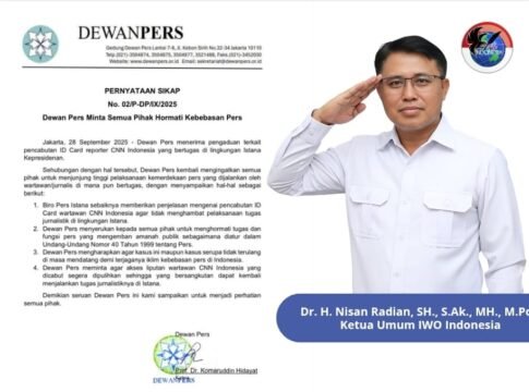 Menurut Nisan Radian, langkah Dewan Pers sudah tepat dan harus menjadi perhatian serius semua pihak. “Pers bekerja menjalankan fungsi kontrol sosial sekaligus mengemban amanah publik. Maka, setiap tindakan yang berpotensi menghambat kerja wartawan harus diluruskan. IWOI berdiri bersama Dewan Pers untuk menjaga marwah kebebasan pers,” tegasnya.